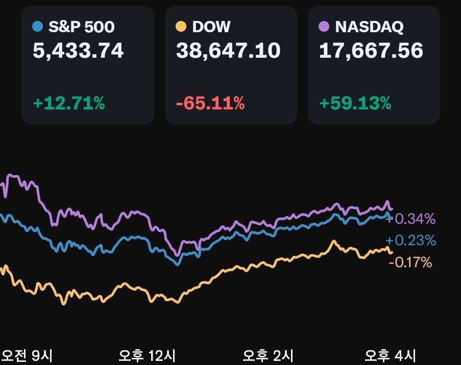 오늘 S&P 500 지수는 0.23% 상승하며 5,433.74를 기록했습니다. 나스닥 100 지수는 0.57% 상승한 19,576.92, 러셀 2000 지수는 0.88% 하락한 2,038.91로 마감했습니다. 주요 지수들의 혼조세는 투자자들에게 일시적인 불안감을 주었지만, 일부 기술주와 대형주들의 상승은 긍정적인 신호를 제공했습니다. 특히, 나스닥 100 지수의 상승은 기술주에 대한 강한 투자 심리를 반영하고 있습니다.