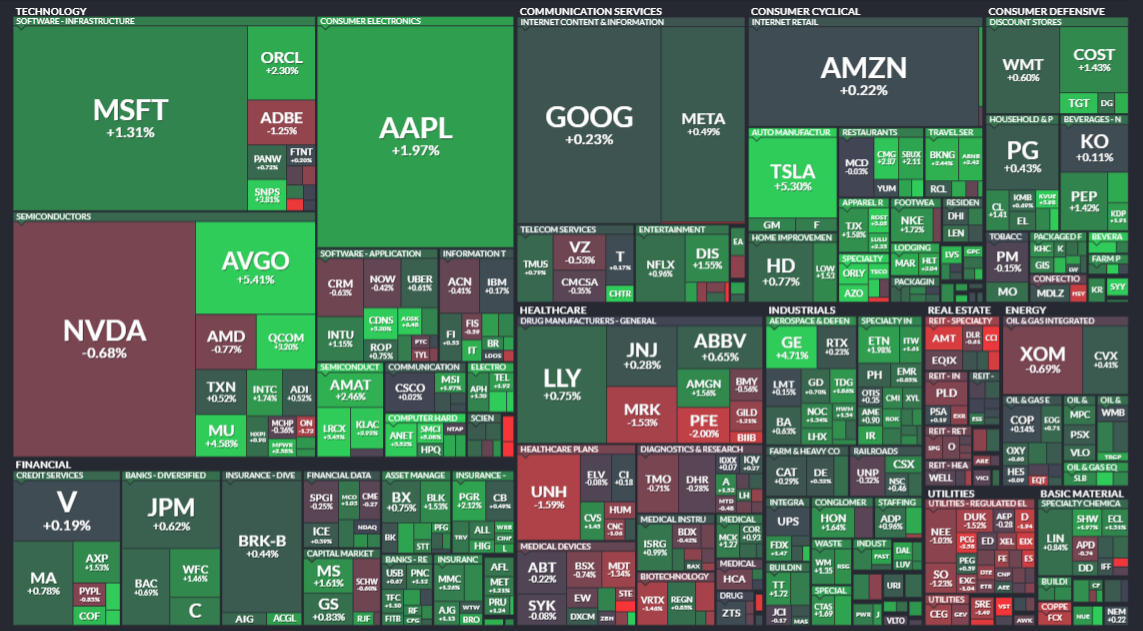 오늘 S&P 500 지수는 0.77% 상승하며 5,473.22를 기록했습니다. 다우 지수는 0.49% 상승한 38,778.10, 나스닥 100 지수는 1.24% 상승한 19,902.75, 러셀 2000 지수는 0.79% 상승한 2,022.01로 마감했습니다. 주요 지수들의 상승은 투자자들에게 긍정적인 신호를 제공했으며, 특히 기술주의 강세가 두드러졌습니다.