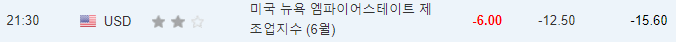 6월 엠파이어스테이트 제조업지수 : -6.0 (예상: -11.3, 이전: -15.6)