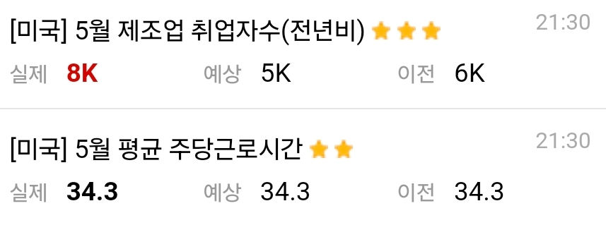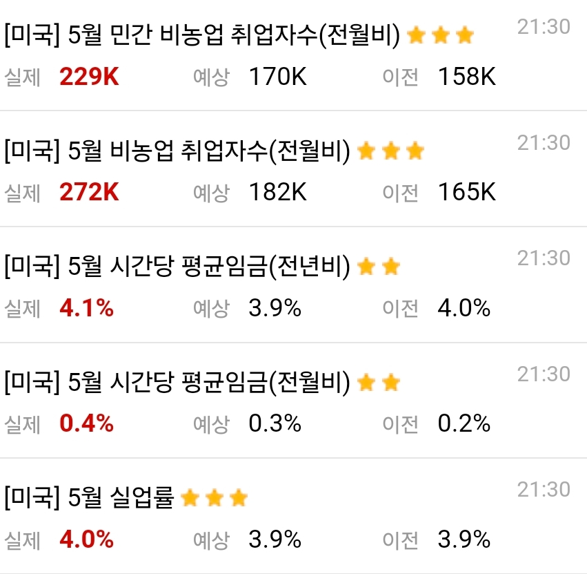 비농업 취업자수는 272K로 예상치 180K를 상회했으며, 이전치 175K보다 크게 증가했습니다. - 미국 5월 실업률