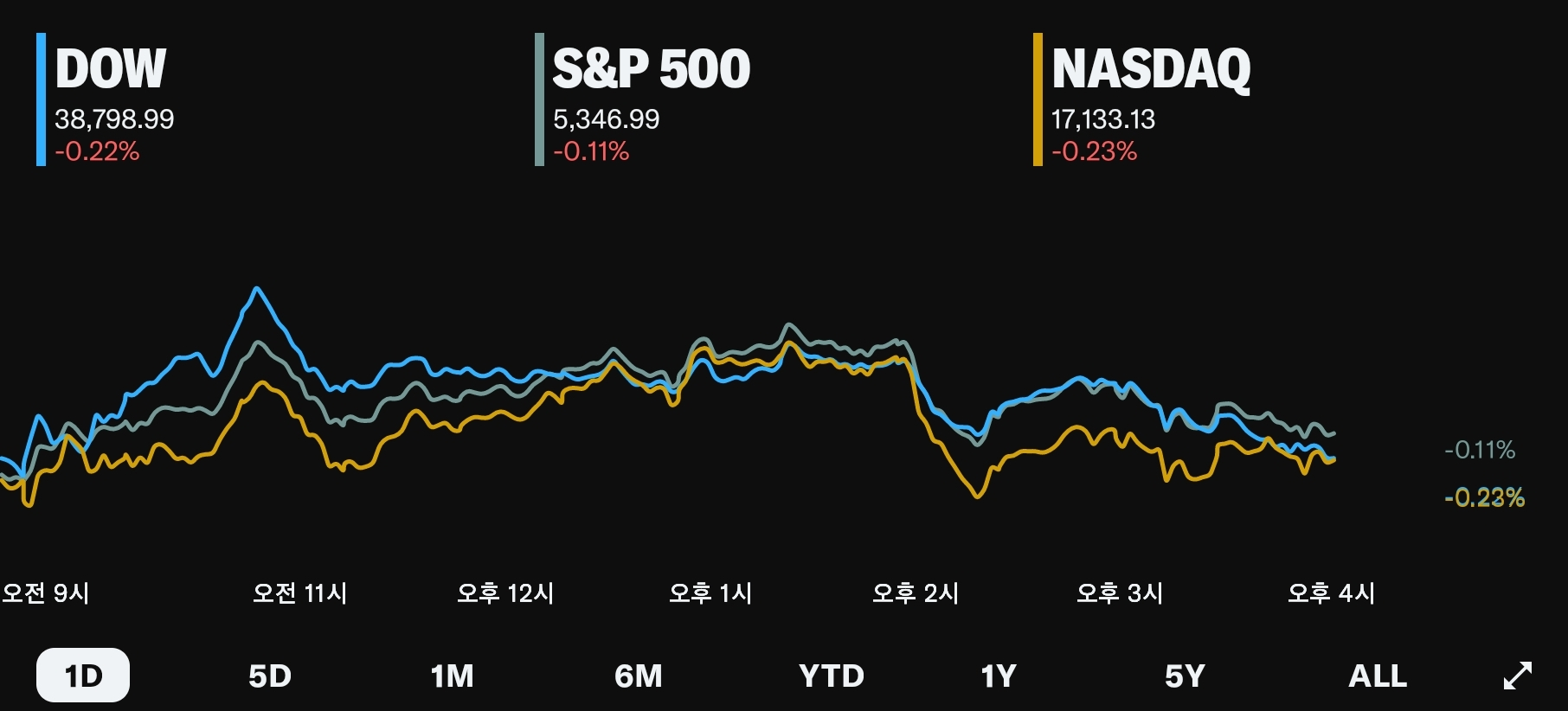 S&P 500 지수는 -0.11% 하락하여 5,346.99를 기록했습니다. - 다우 지수
