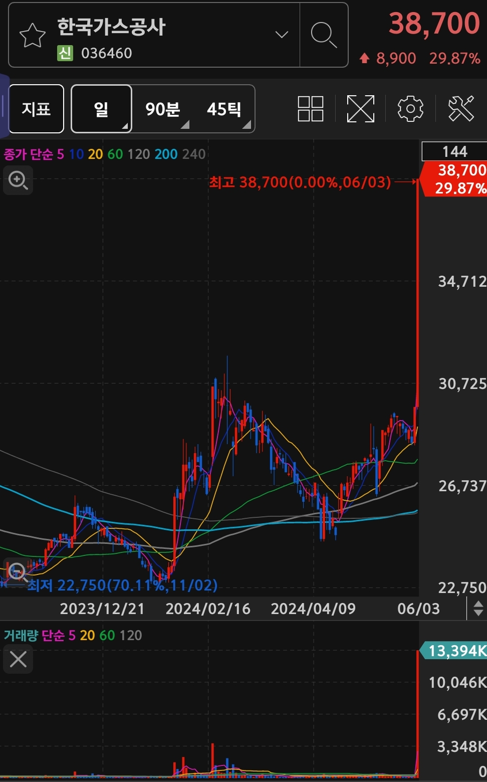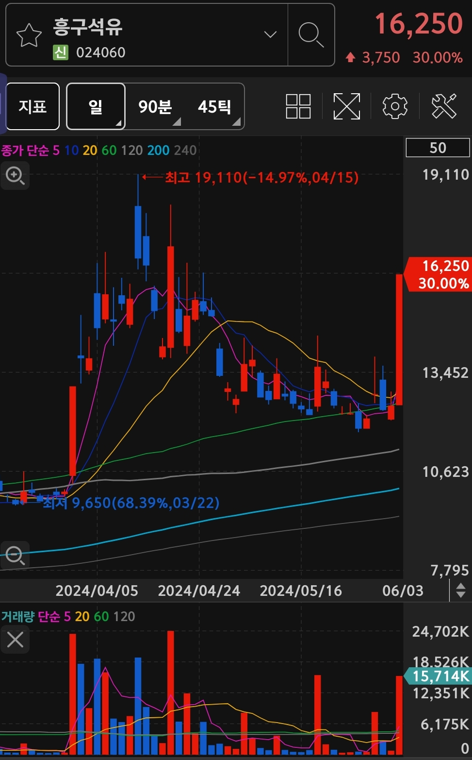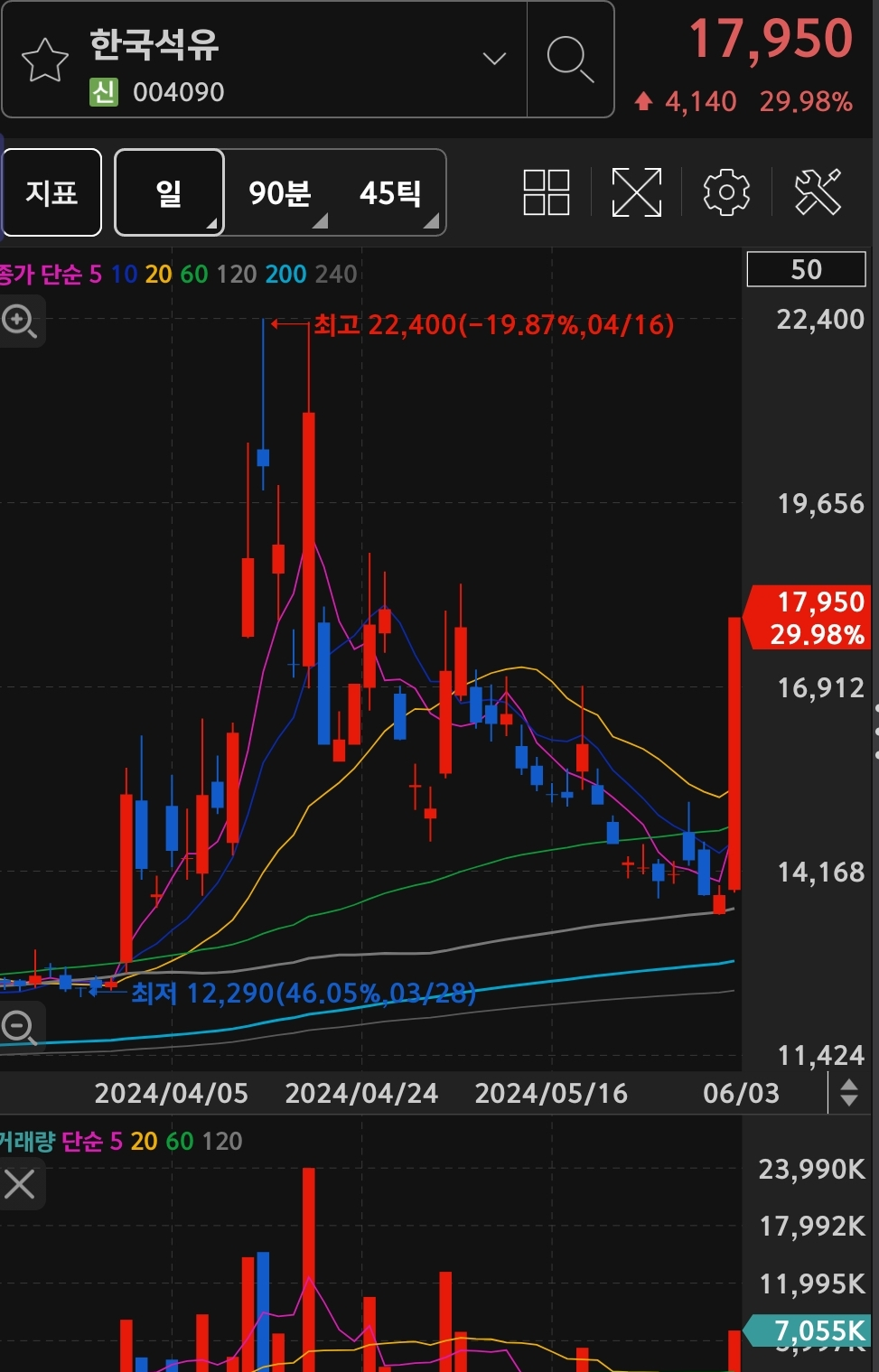 전일 대비 29.98% 17,950원에 상한가에 거래 마무리 되었습니다.